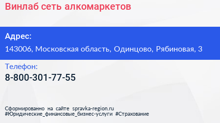 Винлаб, сеть алкомаркетов по адресу 143006, Московская область, Одинцово, Рябиновая, 3 в дальнейшем Организация, размещена в следующих категориях: