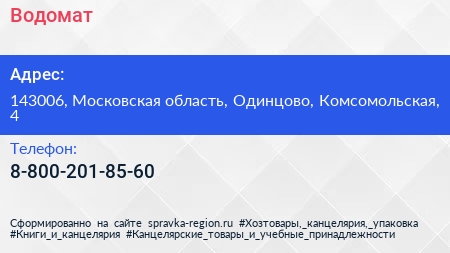 Водомат по адресу 143006, Московская область, Одинцово, Комсомольская, 4 в дальнейшем Организация, размещена в следующих категориях: