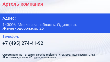 Артель, компания по адресу 143006, Московская область, Одинцово, Железнодорожная, 25 в дальнейшем Организация, размещена в следующих категориях: