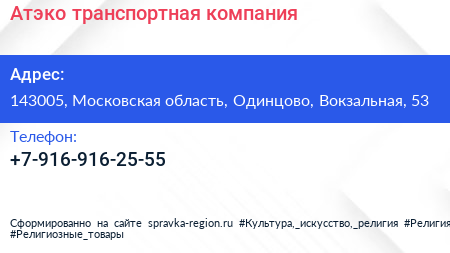 Атэко, транспортная компания по адресу 143005, Московская область, Одинцово, Вокзальная, 53 в дальнейшем Организация, размещена в следующих категориях: