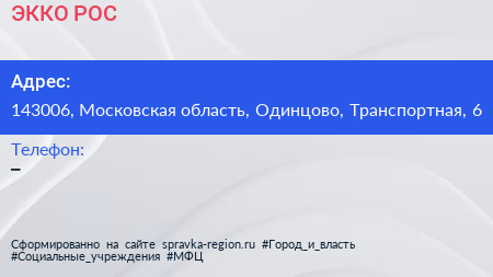 ЭККО-РОС по адресу 143006, Московская область, Одинцово, Транспортная, 6 в дальнейшем Организация, размещена в следующих категориях: