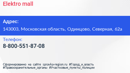 Elektro-mall по адресу 143003, Московская область, Одинцово, Северная, 62а в дальнейшем Организация, размещена в следующих категориях: