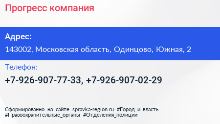 Прогресс, компания по адресу 143002, Московская область, Одинцово, Южная, 2 в дальнейшем Организация, размещена в следующих категориях: