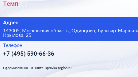 Темп по адресу 143005, Московская область, Одинцово, бульвар Маршала Крылова, 25 в дальнейшем Организация, размещена в следующих категориях: