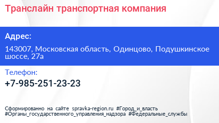 Транслайн, транспортная компания по адресу 143007, Московская область, Одинцово, Подушкинское шоссе, 27а в дальнейшем Организация, размещена в следующих категориях: