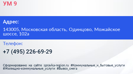 УМ-9 по адресу 143005, Московская область, Одинцово, Можайское шоссе, 102а в дальнейшем Организация, размещена в следующих категориях: