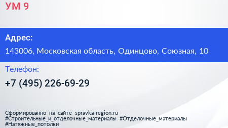 УМ-9 по адресу 143006, Московская область, Одинцово, Союзная, 10 в дальнейшем Организация, размещена в следующих категориях: