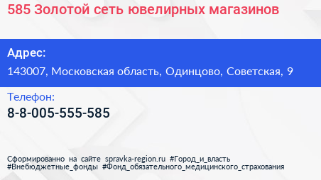 585*Золотой, сеть ювелирных магазинов по адресу 143007, Московская область, Одинцово, Советская, 9 в дальнейшем Организация, размещена в следующих категориях: