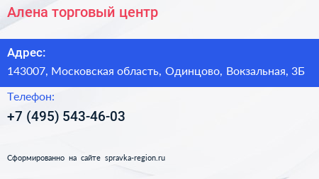 Алена, торговый центр по адресу 143007, Московская область, Одинцово, Вокзальная, 3Б в дальнейшем Организация, размещена в следующих категориях: