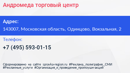 Андромеда, торговый центр по адресу 143007, Московская область, Одинцово, Вокзальная, 2 в дальнейшем Организация, размещена в следующих категориях: