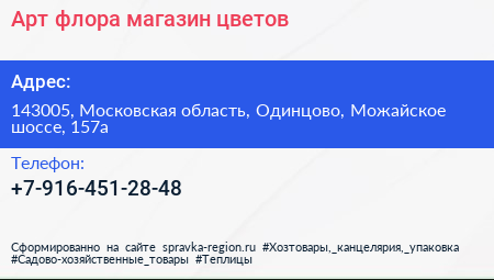 Арт флора, магазин цветов по адресу 143005, Московская область, Одинцово, Можайское шоссе, 157а в дальнейшем Организация, размещена в следующих категориях: