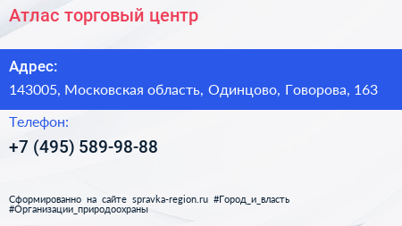 Атлас, торговый центр по адресу 143005, Московская область, Одинцово, Говорова, 163 в дальнейшем Организация, размещена в следующих категориях: