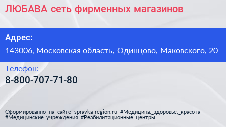 ЛЮБAВA, сеть фирменных магазинов по адресу 143006, Московская область, Одинцово, Маковского, 20 в дальнейшем Организация, размещена в следующих категориях: