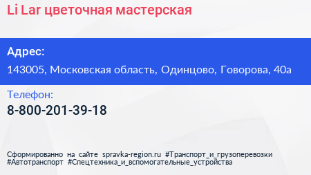 Li.Lar, цветочная мастерская по адресу 143005, Московская область, Одинцово, Говорова, 40а в дальнейшем Организация, размещена в следующих категориях: