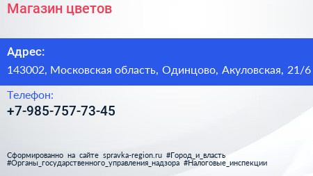 Магазин цветов по адресу 143002, Московская область, Одинцово, Акуловская, 21/6 в дальнейшем Организация, размещена в следующих категориях: