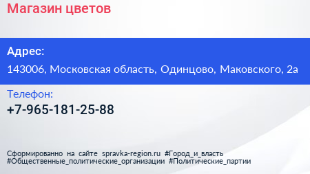Магазин цветов по адресу 143006, Московская область, Одинцово, Маковского, 2а в дальнейшем Организация, размещена в следующих категориях: