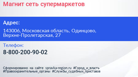 Магнит, сеть супермаркетов по адресу 143006, Московская область, Одинцово, Верхне-Пролетарская, 27 в дальнейшем Организация, размещена в следующих категориях: