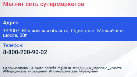 Магнит, сеть супермаркетов по адресу 143007, Московская область, Одинцово, Можайское шоссе, 38г в дальнейшем Организация, размещена в следующих категориях: