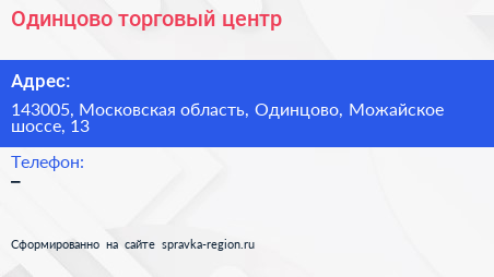 Одинцово, торговый центр по адресу 143005, Московская область, Одинцово, Можайское шоссе, 13 в дальнейшем Организация, размещена в следующих категориях: