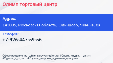 Олимп, торговый центр по адресу 143005, Московская область, Одинцово, Чикина, 8а в дальнейшем Организация, размещена в следующих категориях: