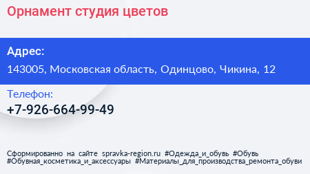 Орнамент, студия цветов по адресу 143005, Московская область, Одинцово, Чикина, 12 в дальнейшем Организация, размещена в следующих категориях: