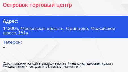 Островок, торговый центр по адресу 143005, Московская область, Одинцово, Можайское шоссе, 151а в дальнейшем Организация, размещена в следующих категориях: