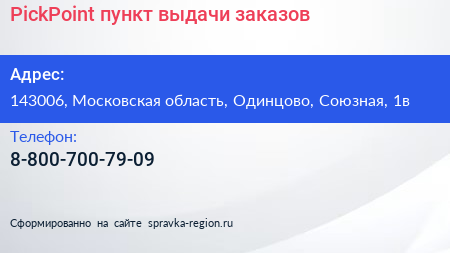 PickPoint, пункт выдачи заказов по адресу 143006, Московская область, Одинцово, Союзная, 1в в дальнейшем Организация, размещена в следующих категориях:
