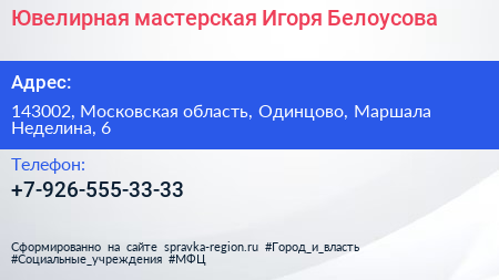 Ювелирная мастерская Игоря Белоусова по адресу 143002, Московская область, Одинцово, Маршала Неделина, 6 в дальнейшем Организация, размещена в следующих категориях: