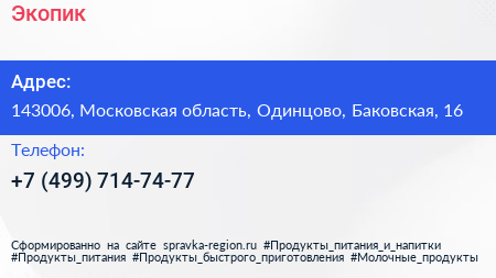 Экопик по адресу 143006, Московская область, Одинцово, Баковская, 16 в дальнейшем Организация, размещена в следующих категориях: