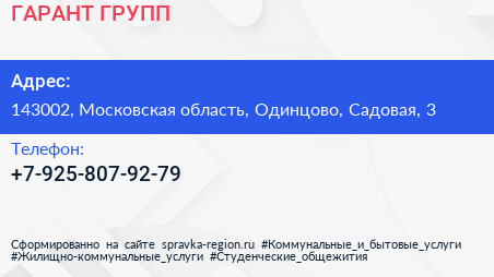 ГАРАНТ ГРУПП по адресу 143002, Московская область, Одинцово, Садовая, 3 в дальнейшем Организация, размещена в следующих категориях: