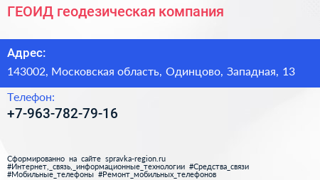 ГЕОИД, геодезическая компания по адресу 143002, Московская область, Одинцово, Западная, 13 в дальнейшем Организация, размещена в следующих категориях: