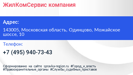 ЖилКомСервис, компания по адресу 143005, Московская область, Одинцово, Можайское шоссе, 10 в дальнейшем Организация, размещена в следующих категориях: