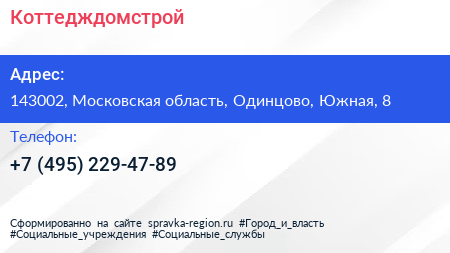 Коттедждомстрой по адресу 143002, Московская область, Одинцово, Южная, 8 в дальнейшем Организация, размещена в следующих категориях: