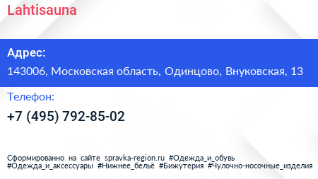 Lahtisauna по адресу 143006, Московская область, Одинцово, Внуковская, 13 в дальнейшем Организация, размещена в следующих категориях: