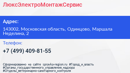 ЛюксЭлектроМонтажСервис по адресу 143002, Московская область, Одинцово, Маршала Неделина, 2 в дальнейшем Организация, размещена в следующих категориях: