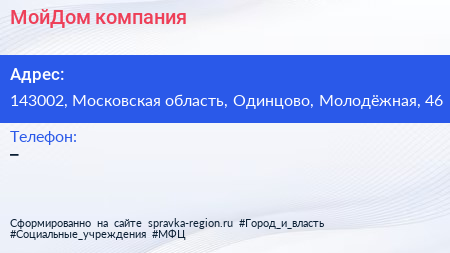 МойДом, компания по адресу 143002, Московская область, Одинцово, Молодёжная, 46 в дальнейшем Организация, размещена в следующих категориях: