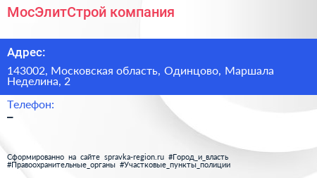 МосЭлитСтрой, компания по адресу 143002, Московская область, Одинцово, Маршала Неделина, 2 в дальнейшем Организация, размещена в следующих категориях: