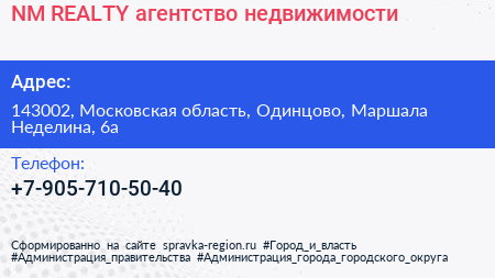 NM REALTY, агентство недвижимости по адресу 143002, Московская область, Одинцово, Маршала Неделина, 6а в дальнейшем Организация, размещена в следующих категориях: