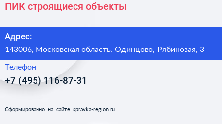 ПИК, строящиеся объекты по адресу 143006, Московская область, Одинцово, Рябиновая, 3 в дальнейшем Организация, размещена в следующих категориях: