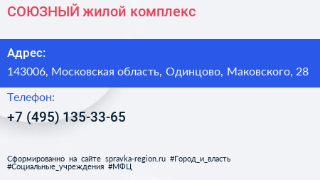 СОЮЗНЫЙ, жилой комплекс по адресу 143006, Московская область, Одинцово, Маковского, 28 в дальнейшем Организация, размещена в следующих категориях:
