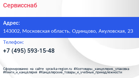 Сервисснаб по адресу 143002, Московская область, Одинцово, Акуловская, 23 в дальнейшем Организация, размещена в следующих категориях: