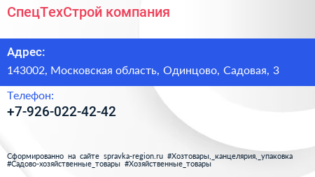 СпецТехСтрой, компания по адресу 143002, Московская область, Одинцово, Садовая, 3 в дальнейшем Организация, размещена в следующих категориях: