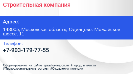 Строительная компания по адресу 143005, Московская область, Одинцово, Можайское шоссе, 11 в дальнейшем Организация, размещена в следующих категориях: