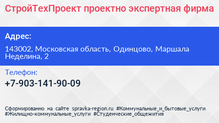 СтройТехПроект, проектно-экспертная фирма по адресу 143002, Московская область, Одинцово, Маршала Неделина, 2 в дальнейшем Организация, размещена в следующих категориях:
