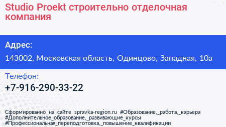 Studio Proekt, строительно-отделочная компания по адресу 143002, Московская область, Одинцово, Западная, 10а в дальнейшем Организация, размещена в следующих категориях: