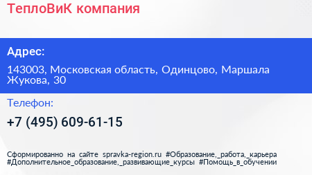 ТеплоВиК, компания по адресу 143003, Московская область, Одинцово, Маршала Жукова, 30 в дальнейшем Организация, размещена в следующих категориях: