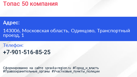 Топас 50, компания по адресу 143006, Московская область, Одинцово, Транспортный проезд, 1 в дальнейшем Организация, размещена в следующих категориях: