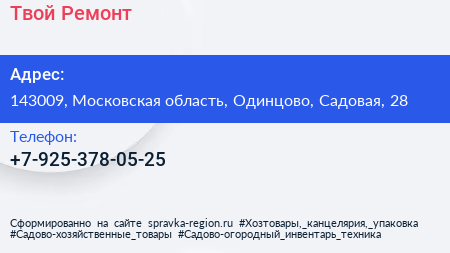 Твой Ремонт по адресу 143009, Московская область, Одинцово, Садовая, 28 в дальнейшем Организация, размещена в следующих категориях:
