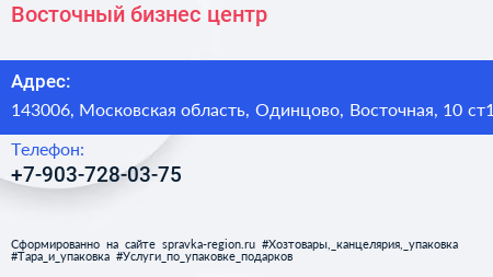 Восточный, бизнес-центр по адресу 143006, Московская область, Одинцово, Восточная, 10 ст1 в дальнейшем Организация, размещена в следующих категориях: