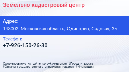 Земельно-кадастровый центр по адресу 143002, Московская область, Одинцово, Садовая, 3Б в дальнейшем Организация, размещена в следующих категориях: